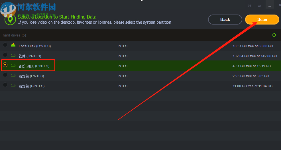 2.在恢复功能界面中,我们需要勾选想要扫描的磁盘,选中磁盘之后点击右上角的Scan按钮即可开始进行扫描。