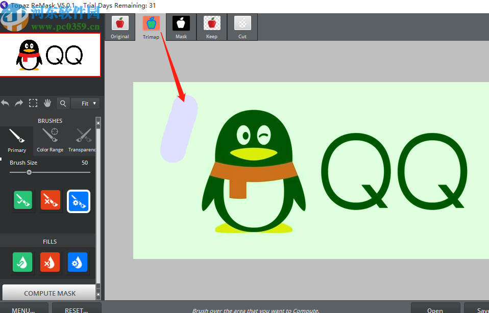 3.点击打开之后我们就可以开始抠图了,在Trimap这个功能模块中按住鼠标左键即可选取在图片中不需要的位置,也就是紫色区域的位置。