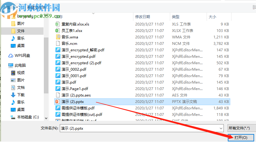 2.点击添加文件之后接下来在选择文件的界面中我们就可以找到自己想要加密的文件了,选中之后点击打开按钮即可。