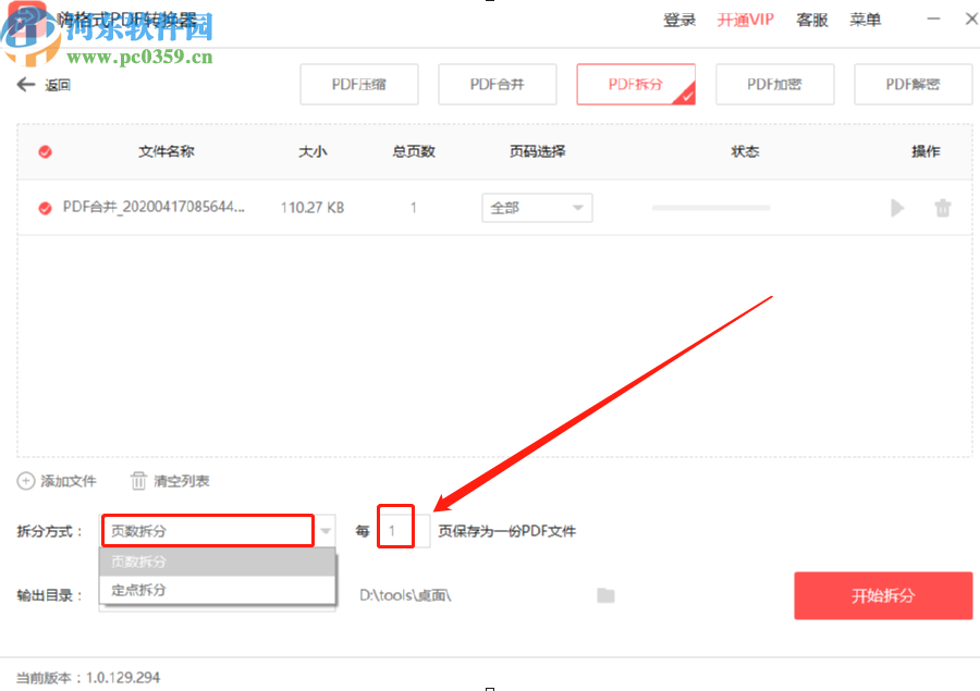 4.完成上一步操作之后我们选择的PDF文件就成功添加进来了,然后我们就可以选择想要拆分文件的方式了,选择页数拆分的话需要设置每多少页拆分为一个PDF文件。