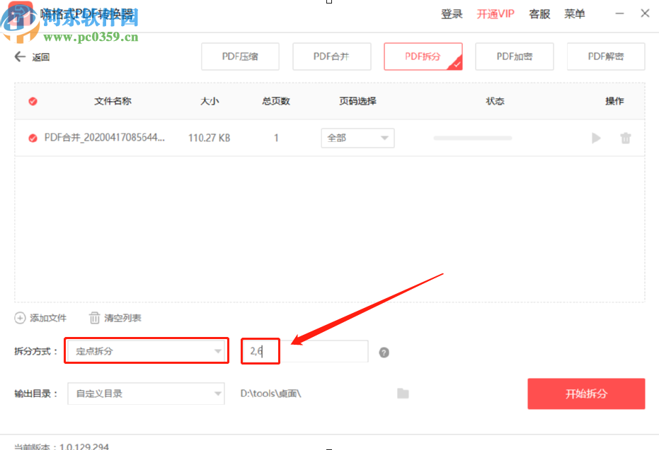 5.如果选择的是定点拆分方式的话,我们在后面的输入框中输入想要定点拆分的页面数字,用逗号隔开即可。