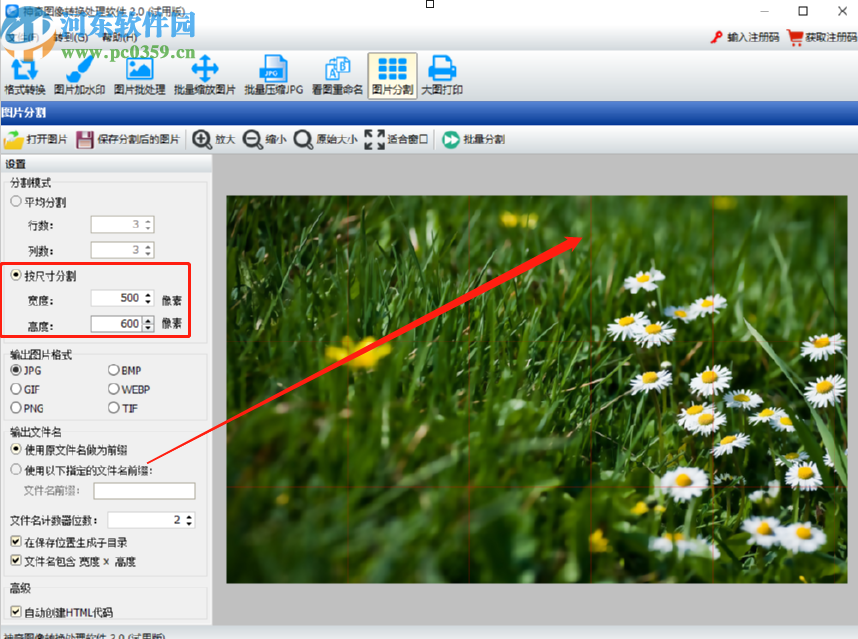 4.另外还有按尺寸分割的方式,用户可以根据自己的需求来输入想要分割的尺寸,然后在界面中可以看到红色的分割辅助线,查看分割之后的效果。