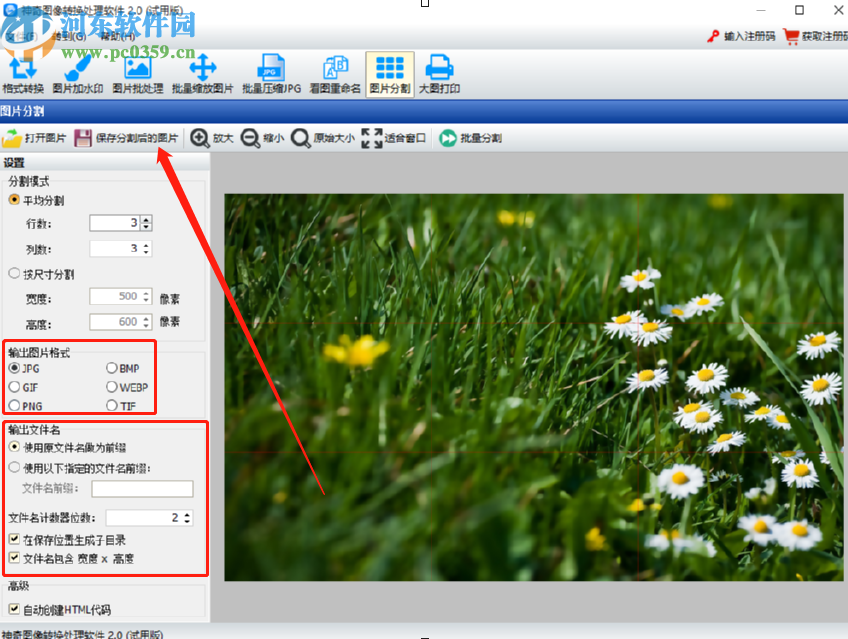 5.选择好分割图片的方式之后,我们点击界面左边的输出图片格式这个选项,可以对图片的输出格式进行选择,还有输出文件名也是可以进行设置的,根据自己的需求设置完成之后我们点击左上方的“保存分割后的图片”这个功能按钮。