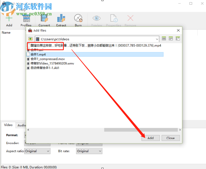 2.点击添加按钮之后下一步就出现一个选择添加文件的界面了,在这个界面中我们选中想要转换的MP4视频文件之后点击右下方的Add这个添加按钮。