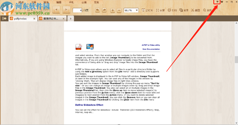 3.点击打开PDF文件之后我们进入到阅读状态,然后找到自己想要添加书签的位置,接着点击右上角的倒三角图标,如下图中所示。