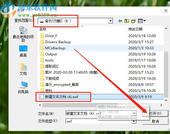 2.点击转换按钮之后会出现一个选择SWF文件的界面,也是我们整个操作过程中最重要的一步,在这里我们只需要打开想要转换的SWF文件所在的文件夹,找到它之后选中并点击打开按钮。