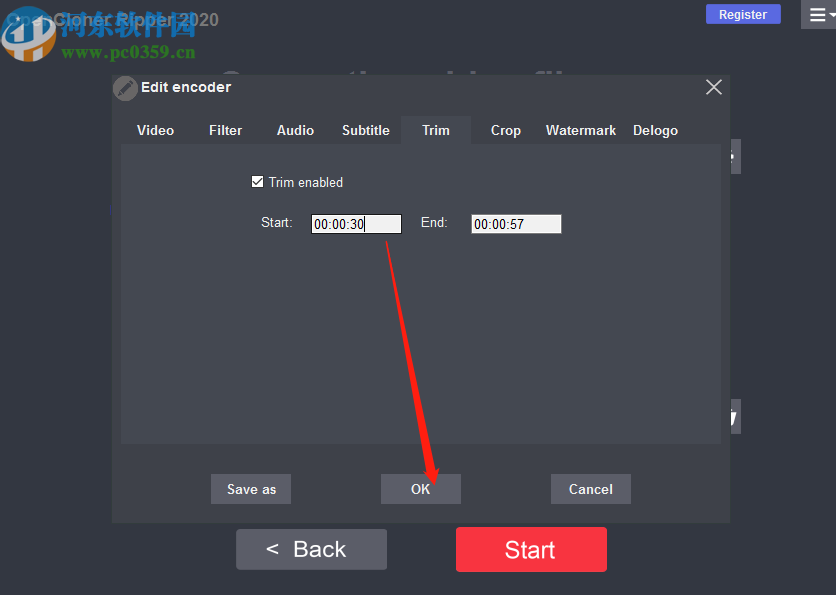 6.勾选这个选项之后下一步我们就可以设置自己想要剪切的时间段了,事先需要打开视频查看,然后记住想要剪切的开始时间和结束时间,在这输入之后点击OK按钮即可。