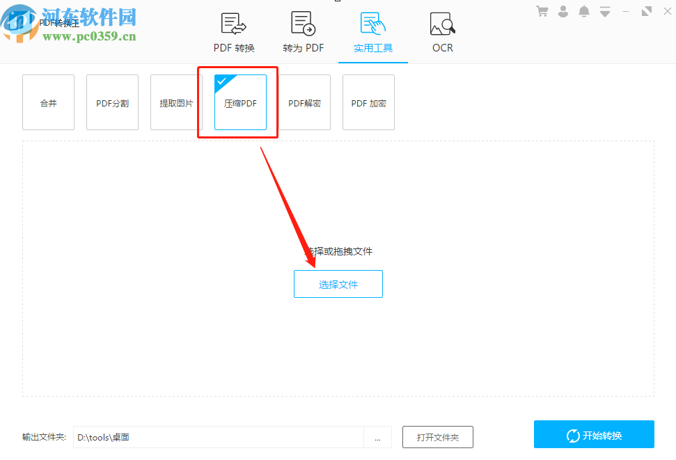 2.切换到软件的PDF工具界面之后,我们选中压缩PDF的功能图标,选中之后点击中间的选择文件按钮。