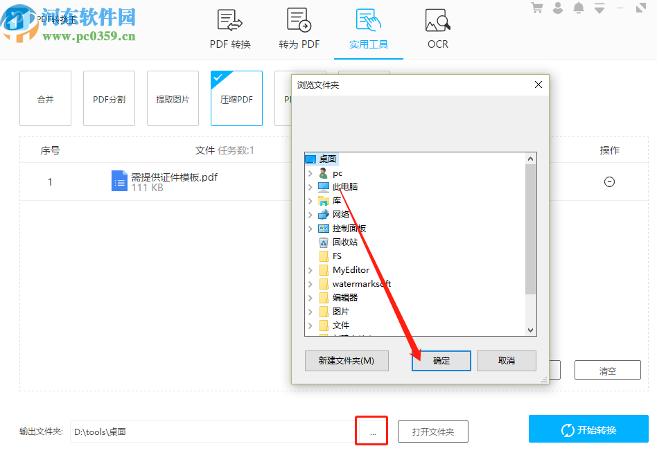 5.最后我们根据自己的需求来设置好压缩文件的输出目录之后,点击界面右下角的开始转换这个功能按钮就可以开始转换压缩PDF文件了。