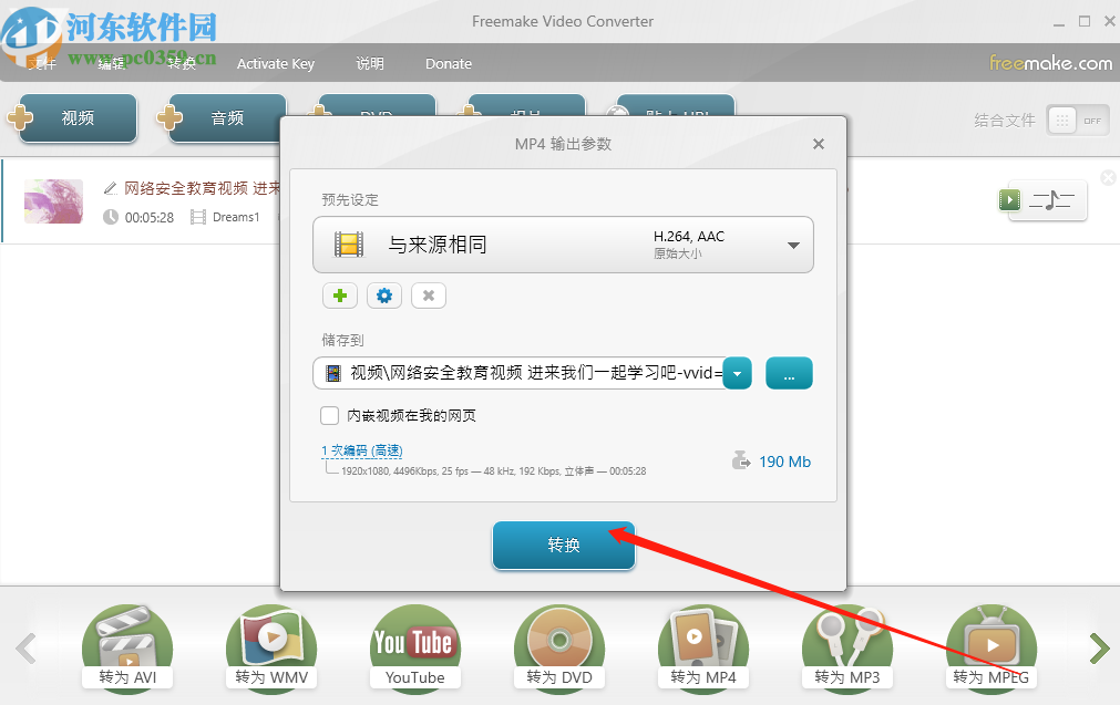 7.最后在转为MP4这个功能的参数设置界面,我们点击转换按钮就可以将添加了视觉效果的视频转换保存下来了。