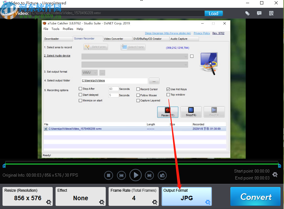 3.点击打开按钮之后视频就添加成功了,然后我们需要点击下方的JPG这个按钮,点击之后即可选择转换的图片格式。