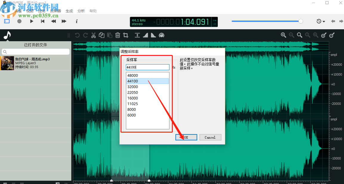 5.点击打开调整采样率的功能界面之后,我们就可以根据自己的需求来选择想要的采样率了,选择之后点击OK按钮即可。