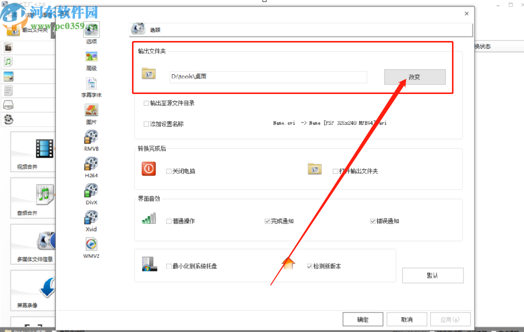 2.进入到软件的选项设置界面之后我们就可以看到输出文件夹这个模块了,然后我们需要点击其中的改变按钮。