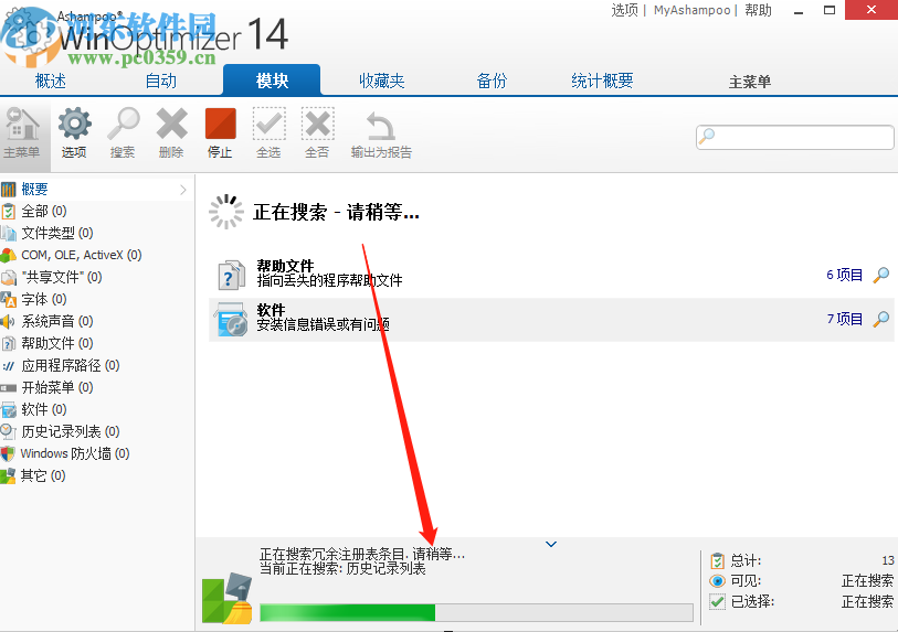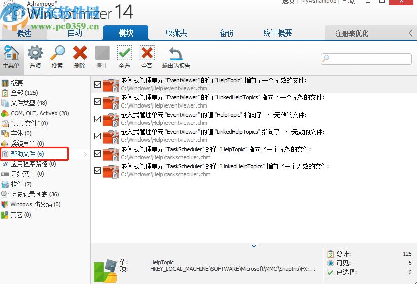 5.比如小编找到帮助文件选项点击进去,然后就可以查看到帮助文件这个类型的注册表中有多少无效的注册表信息了。