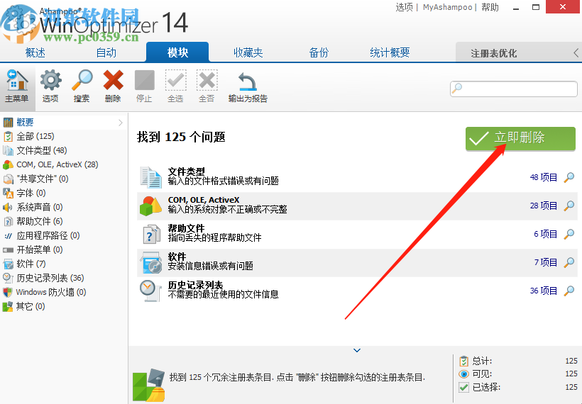 6.最后我们只需要在扫描结果页面,点击右上方的这个立即删除按钮就可以删除这些扫描出来的注册表信息。