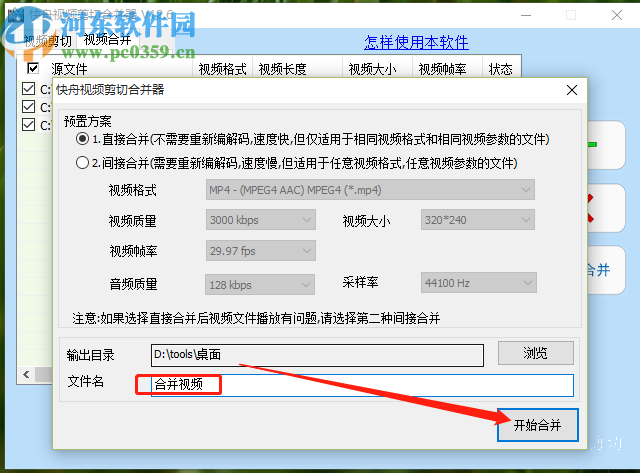 6.最后点击选择好合并视频的储存路径之后,在文件名输入框中输入想要保存的文件名,点击右下角的开始合并按钮就可以开始合并视频文件了。
