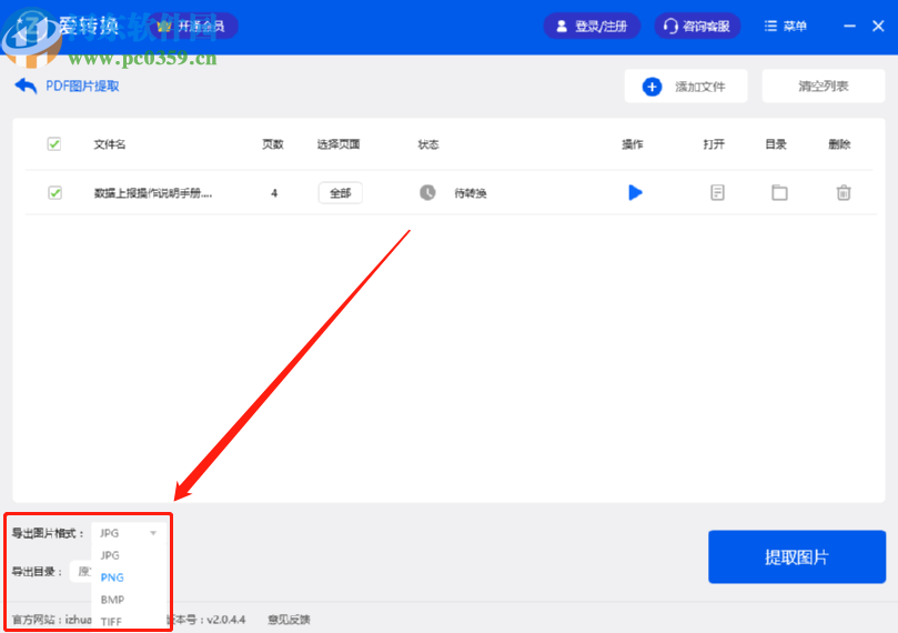 4.点击打开按钮之后在界面的左下角即可选择想要提取图片的导出格式,打开下拉列表有多种图片格式可以选择。
