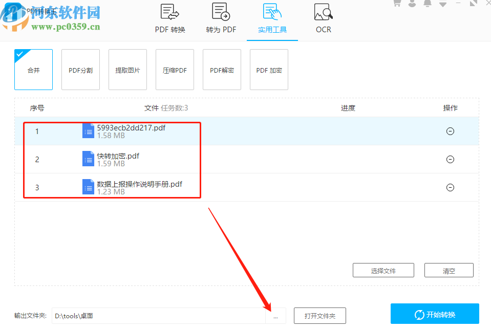 5.点击确定按钮之后设置好输出文件夹,下一步就可以点击右边的开始转换按钮开始合并PDF文件的操作了。