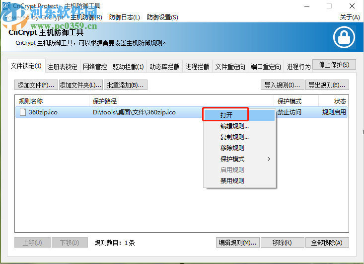 6.经过上一个步骤这个文件锁定保护的功能就设置完成了,然后我们回到软件主界面可以看到添加的文件锁定规则,此时之后在软件界面右键点击打开才可以查看被锁定的文件,在其他地方是禁止访问的。