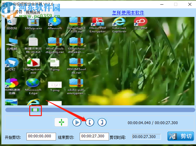 3.点击打开按钮将视频添加到软件界面之后,就可以对视频的剪切时间进行设置了,移动视频进度条上的图标选择开始时间,然后点击“[”图标。