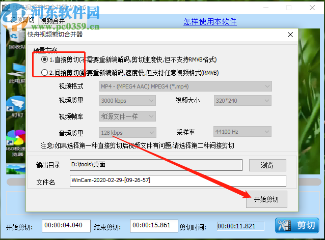 7.最后在出现的剪切视频界面可以选择剪切预置方案,还有输出目录和文件名可以进行设置,设置完成点击右下角的开始剪切按钮即可。