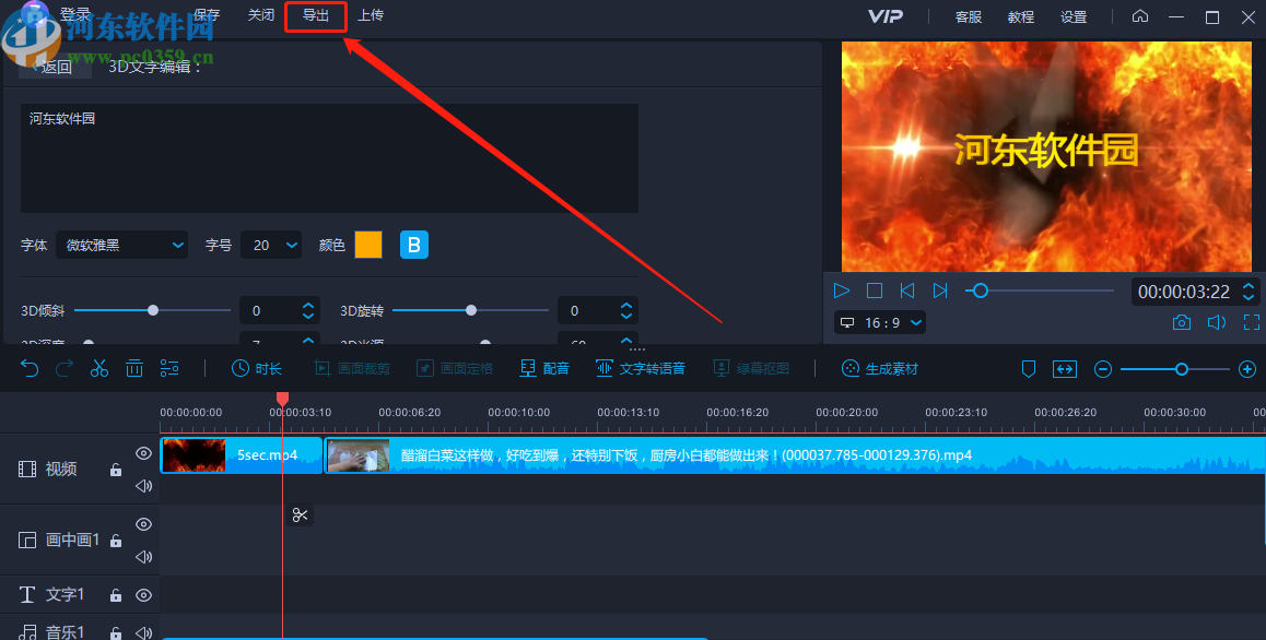7.点击完成之后我们可以点击播放预览片头添加的效果,最后点击上方的导出按钮可以将添加好片头的视频导出保存。