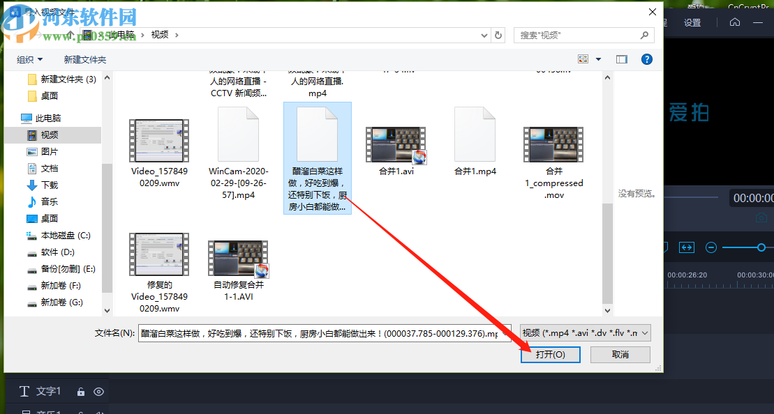 3.点击导入之后就会打开一个选择文件的界面了,在这个界面中我们选中目标视频文件之后点击右下角的打开按钮。
