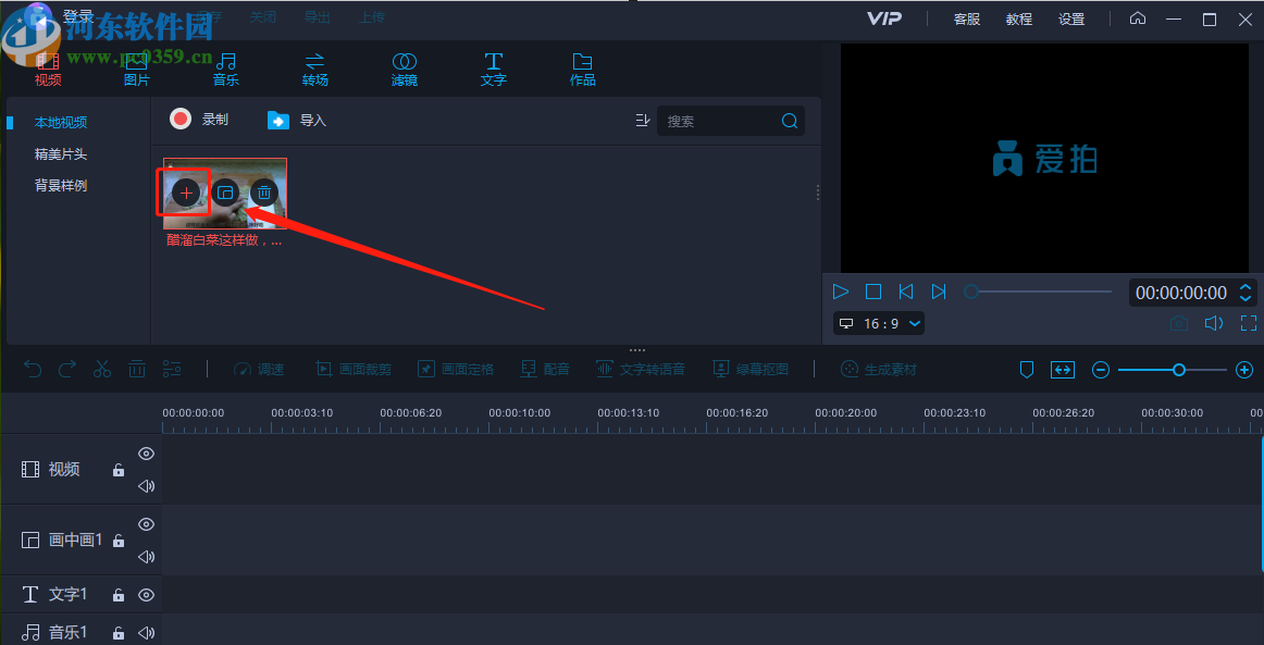 4.点击打开按钮之后在界面就可以看到添加进来的视频了,点击添加图标即可将视频添加到下方的操作轨道当中。