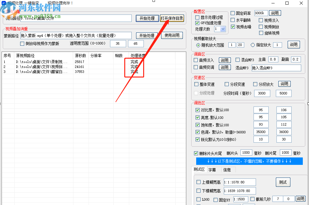 5.等到删除操作完成之后,界面中会显示处理进度为完成,然后点击右上方的打开保存目录按钮即可查看去除片头片尾后的视频文件。