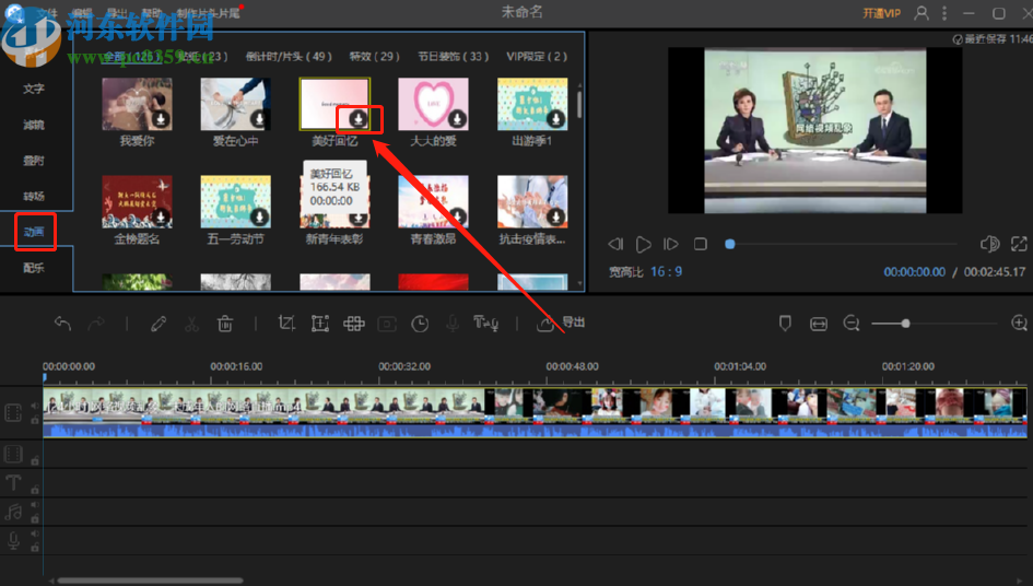 5.动画下载完成之后,我们选中动画之后拖拽到下方的视频操作轨道中,然后就会自动衔接到视频的尾部。