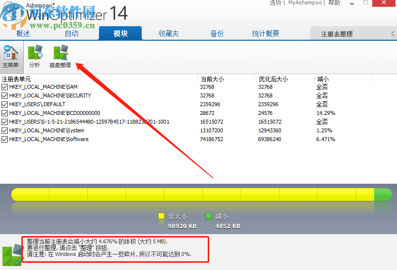 5.等到分析完成之后,界面下方会显示分析出来的一些数据,整理当前注册表可以减少多少体积,我们点击上方的磁盘整理按钮即可开始整理。