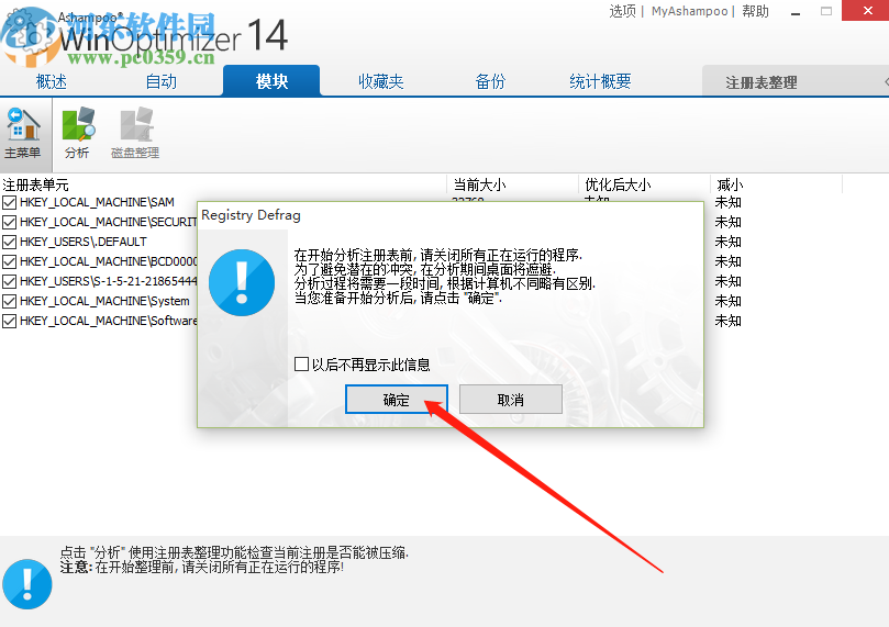 4.点击分析按钮之后会出现下图所示的界面,提示我们在分析之前需要关闭所有程序,完成之后点击确定按钮即可开始分析。