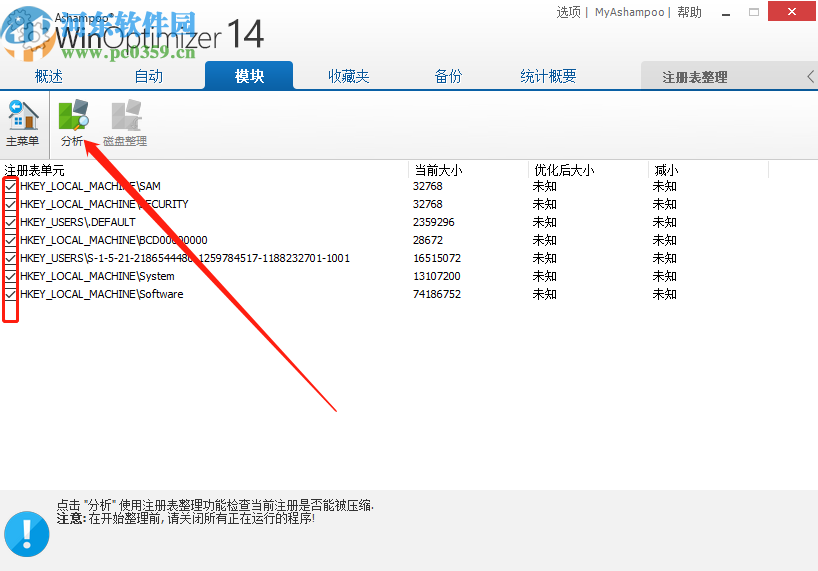 3.点击进入到整理注册表功能界面之后,我们勾选想要整理的注册表单元,勾选之后点击上方的分析按钮。