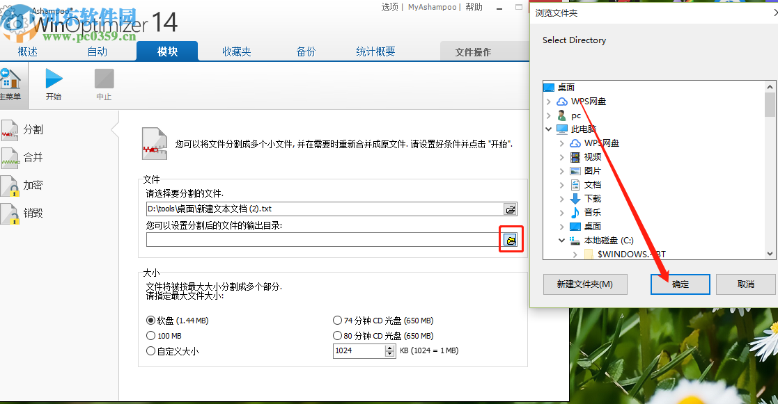 5.点击确定按钮之后,下一步在下方的大小位置,选择想要分割的大小方式,还可以选择自定义大小。