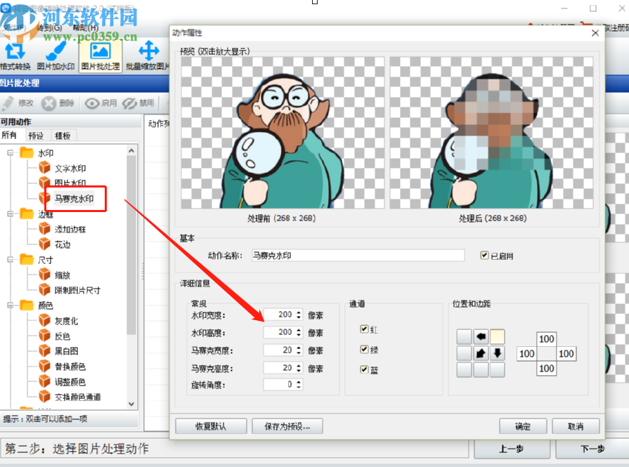 4.点击下一步按钮之后,我们进入到编辑图片的功能界面,然后在界面中选中马赛克水印功能并双击,双击之后在出现的选择文件界面中可以设置马赛克水印的宽度和高度等参数。