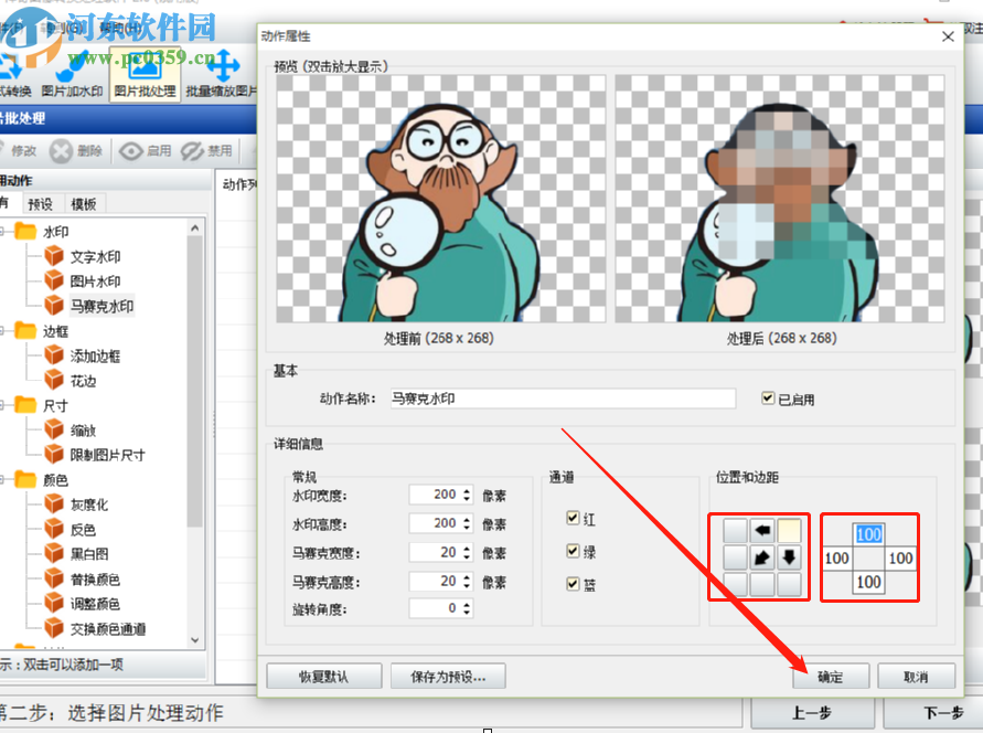 5.设置好宽度等详细信息之后,可以设置马赛克的边距和位置,根据自己的需求设置完成之后点击确定按钮即可。