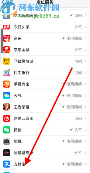 3.进入到定位服务界面之后,我们在其中找到支付宝这款应用,找到之后点击进入到其中。
