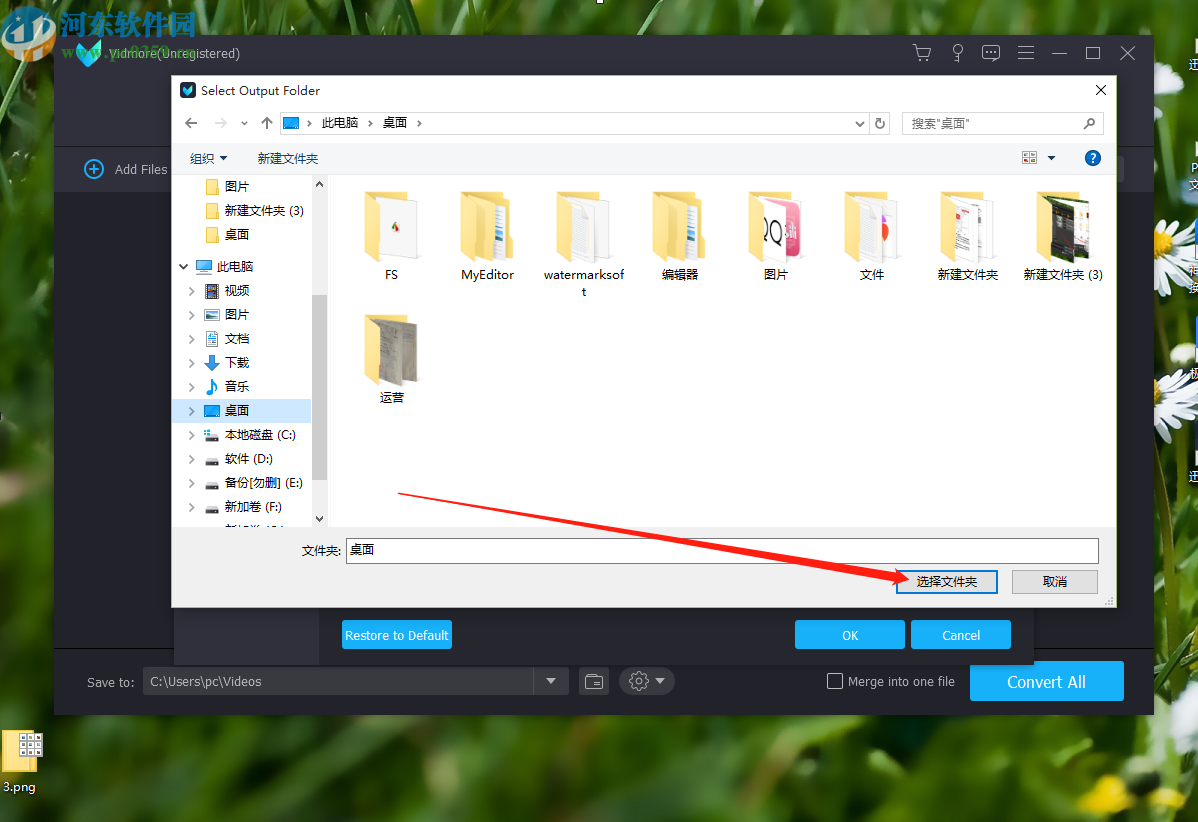 5.点击三个圆点按钮之后就会打开一个选择文件的界面,我们选中自己想要使用的默认输出文件夹之后,点击右下角的选择文件夹按钮。