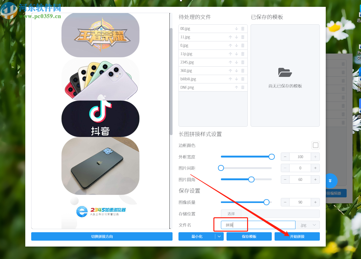 7.最后设置好拼接图片的这些参数之后,我们在下方的保存设置中设置文件名称,然后点击右下角的开始拼接按钮即可开始拼接操作。
