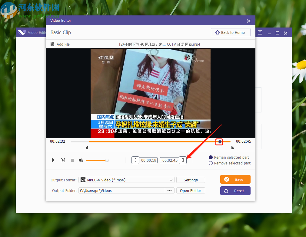 6.开始位置和结束位置都选取完成之后,想要剪切的视频片段就选择完成了,然后我们点击右下方的Save按钮即可将选取的这个片段剪切保存下来。