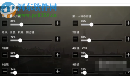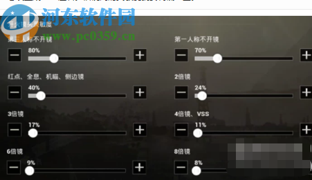 3.然后就是开火镜头的灵敏度设置,我们需要将这个灵敏度调的低一些,如下图所示人称不开镜为80%,红点、全息等设置为30%,这样的话倍镜越高灵敏度就会越低。