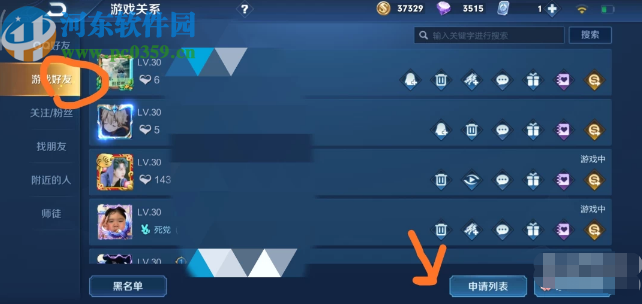 2.点击这个好友图标之后,我们在出现的界面左侧切换到游戏好友这个功能模块,然后再点击界面中的申请列表这个功能按钮。