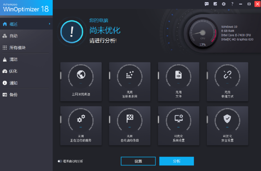 AshampooWinOptimizer是一款功能非常强大的系统优化工具,它通过很多种优化的功能帮助用户在使用电脑的时候优化系统运行速度,能够快速安全的提示电脑的使用效率,其中就有