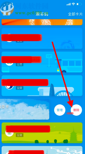 3.点击全部图标之后我们就可以看到应用中已经绑定使用的一些公交卡。选中想要删除的那一个向左滑动,在出现的图标中点击删除按钮。