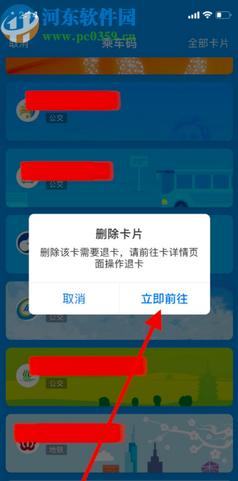 4.点击删除之后会提示我们删除卡片的话需要到详情页去操作退卡,我们点击这个提示界面的立即前往按钮。