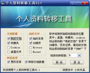 个人资料转移工具,可更改目录的路径并转移目录中的文件,与其他软件不同的是,本软件可多次移动,其他软件一般只是从C盘转移出来,再转移就转移不了了,而本软件直接读取注册表中的位置,不管目录移动到哪里都能找到并进行操作。