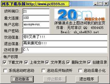随着宽带上网的人越来越多,朋友之间的文件共享与交流成了一个问题,用QQ MSN之类的传送吧,很不方便,速度也是一个问题,装个Server-U吧,似乎夸张了点。而且说不定给你弄个漏洞出来,危害到你电脑的安全,这就不好了。而这个20CN MINI FTPD 正好满足你的要求。很小的个头,很绿色。有需要时打开,不需要的时候关闭,当然也可以选择适当的目录,永久性的共享给你的朋友。把用户名和密码告诉你的朋友,他们就可以随时来下载你分享给他们的东西了。
