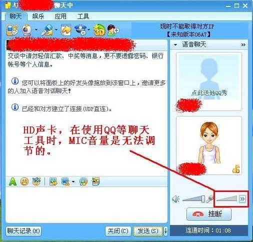 当使用HD声卡的主板时,以QQ为例,你会发现在语音聊天时MIC音量不可调。