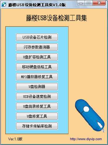 这个工具集集成了10个网上浒USB设备的检测工具,能够对大多数USB接口的U盘、移动硬盘、MP3播放器等设备进行检测或修复,集成的目的主要是使用方便。
