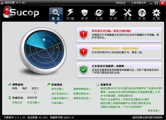 超级巡警是一款用来自动解决如今泛滥的利用ROOTKIT的隐藏进程,隐藏文件,隐藏端口的各种HACKDEF、NTRootKit、灰鸽子、PCSHARE、FU RootKit、AFX RootKit之类的木马,解决基于各种启动方式:SVCHOST宿主加载,进程感染, SPI链挂接的各种后门,对抗各种加壳变形以及版权伪装的后门,对抗越来越猖獗的流氓软件。它弥补传统杀毒软件的不足,提供非常有效的文件监控和注册表监控,使得你对系统的变化了如指掌。提供了多种专业级的工具,使得你可以自己手动分析,100%的查杀未知木马,亲自体验斩杀木马的快感!